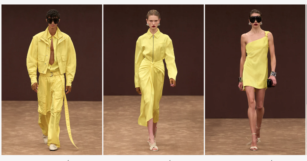 La colección se distingue por una paleta de colores que va desde el icónico rojo de Ferrari hasta tonos sofisticados como tabaco, terracota y marfil. La culminación de esta gama es un amarillo vibrante que resalta en los tejidos más lujosos, aportando frescura y dinamismo a cada look.