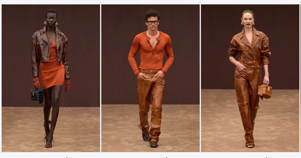 Las texturas juegan un papel fundamental, con superficies que vibran y cambian, desde nylon hasta piel acolchada, adornadas con pinceladas que evocan el espíritu de los años setenta. El uso de Q-CYCLE by Ferrari en prendas de punto y acabados técnicos de sarga subraya el compromiso de la marca con la sostenibilidad.