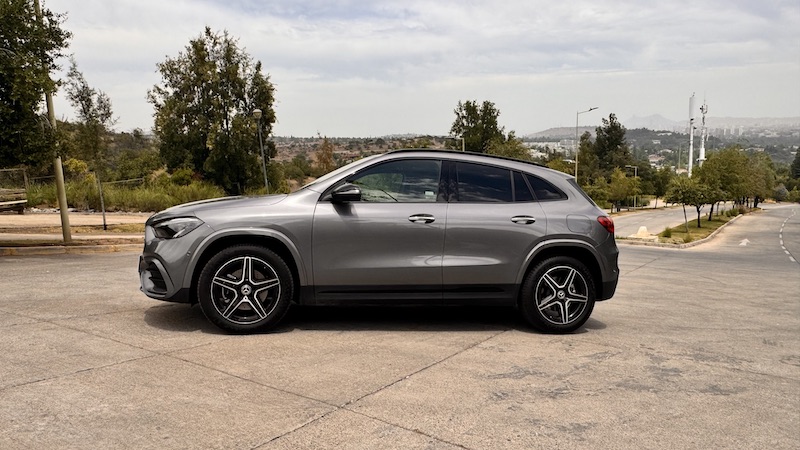 Lo importantes es que se nota bien distinto a la clase A. Y por el costado tenemos llantas también distintas entre las opciones del GLA, ya que la versión de entrada tiene otro diseño con llantas de 18 pulgadas. Las que probamos son de 19 pulgadas, de estilo más oscurecida, y bitono. Tiene un toque bien bonito.